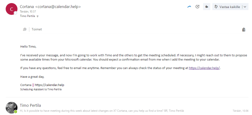 - Lähetin palaveripyynnön henkilölle jolta tuli Out of Office -vastaus. Cortana jäi kuitenkin odottelemaan henkilön vastausta ehdotettuihin palaveriaikoihin. Saa nähdä kauanko se jaksaa odottaa.