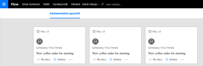 Mikäli organisaatiossa olisi Flow:lla toteutettuna useita hyväksymistyönkulkuja, kaikki odottavat pyynnöt löytyisivät tästä yhdestä paikasta.