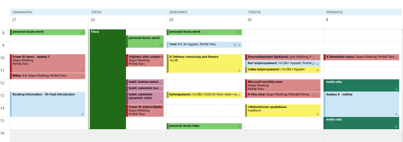 Outlookissa voi tehdä oman näkymän, jossa kalenterimerkintöjä esitetään eri väreillä. Käytän seuraavaa jaottelua: