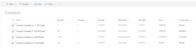 Ratkaisun pohjana oleva dokumenttikirjasto ei kuitenkaan tue tätä. Ensin pitää luoda sopimuksia varten lista (list) ja siirtää kaikki sopimukset sinne.