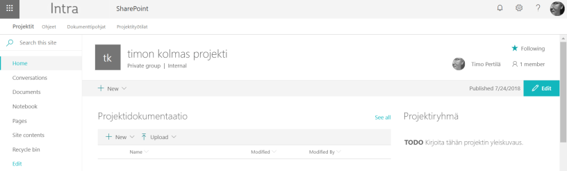 Lopputuloksena on tiimisivuston pohjalta muokattu projektisivusto, joka on liitetty hub-sivustoon (Projektit).
