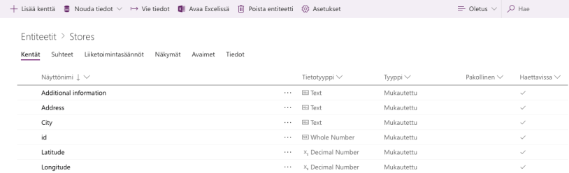Pienen näpyttelyn jälkeen Stores-entiteetti näyttää seuraavalta.