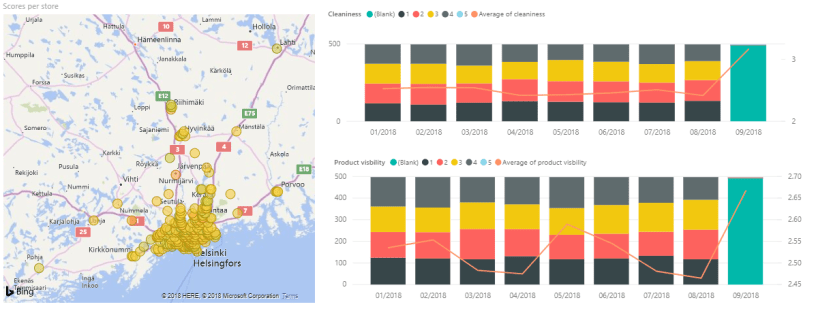 - Kartalla myymälät, joiden väri kertoo tällä kertaa myymälän arvosanan (score), joka on käytännössä siisteyden ja tuotteiden näkyvyyden arvosanojen summa.