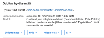 Haastattelijoiden sähköpostiin saapuu kysymys ”Pyydetäänkö haastateltava seuraavalle kierrokselle”. Kysymykseen voi vastata