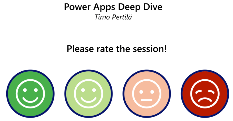 Osallistumissani tapahtumissa kerättiin palautetta esityksistä eri tavoin, mutta pisimmän korren vei SharePoint Satruday Munchen. Siellä jokaisen luennon jälkeen salista poistuttaessa vastassa oli henkilö tabletin kanssa. Tabletilta jokainen sai arvostella esityksen käyttäen neljää tuttua hymynaamaa (kuva happyornot:in vastaavasta ratkaisusta).