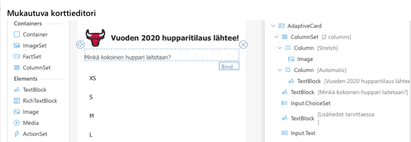 Seuraavaksi pitäisi rakentaa se kortti. Tämä onnistuu mainiolla https://adaptivecards.io/designer/ työkalulla.