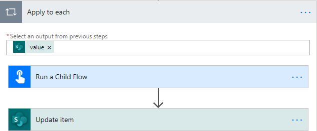 Seuraavaksi teemme Flow:n, joka käy läpi SharePoint-listan rivit. Jokaisen rivin kohdalla se käynnistää juuri luomamme Flow:n. SharePoint-listalle tallennetaan käynnistetyn Flow:n palauttama näyttönimi.