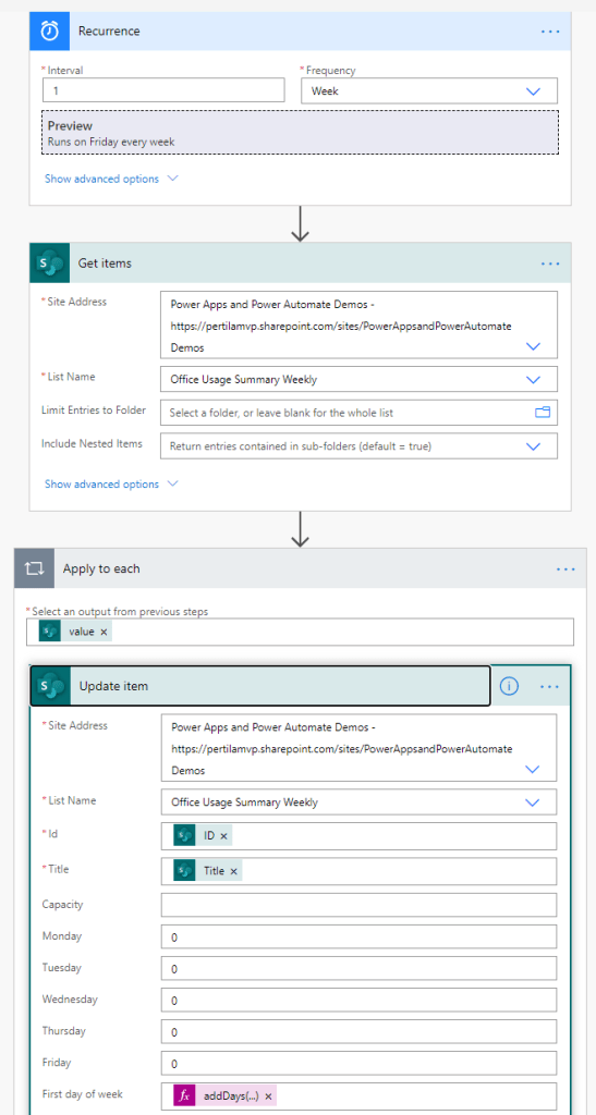 Jos käyttäjä ilmoittaa viikon alussa tulevansa joka päivä toimistolle X, generoisi tämä logiikka viisi peräkkäistä päivitystä samaan SharePoint-listan riviin. Yhden jokaiselle viikonpäivälle.