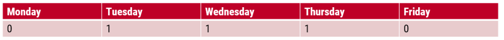 - Paljonko kullekin viikonpäivälle on tulossa työntekijöitä paikalle (Monday, Tuesday, Wednesday...)