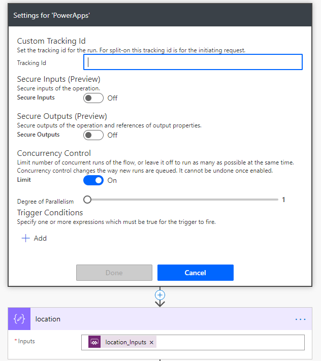 Siispä Flow:n käynnistimen (trigger) asetuksista rinnakkaisuuden hallinta (Concurrency control) päälle ja sallitaan vain samanaikainen suoritus (Degree of Paralleism).