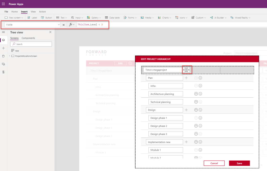 ClearCollect(colProjetHiearchyForEdit,LookUp(colTmp,Level = 1));