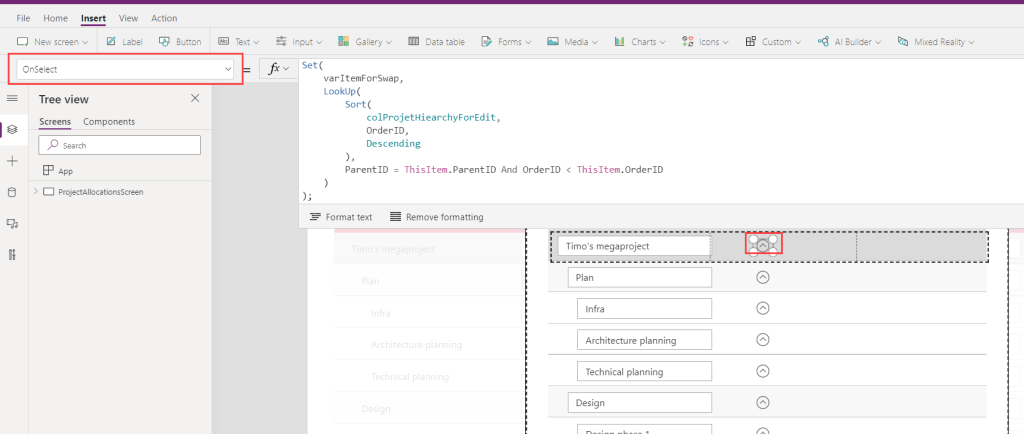 Ratkaisu oli pikkuriikkisen tahmea. Syy hitauteen on ilmeinen. Vaihdettaessa rivien järjestystä, piirtää Power Apps uudelleen koko gallerian sekä sen sisältämät varausgalleriat.