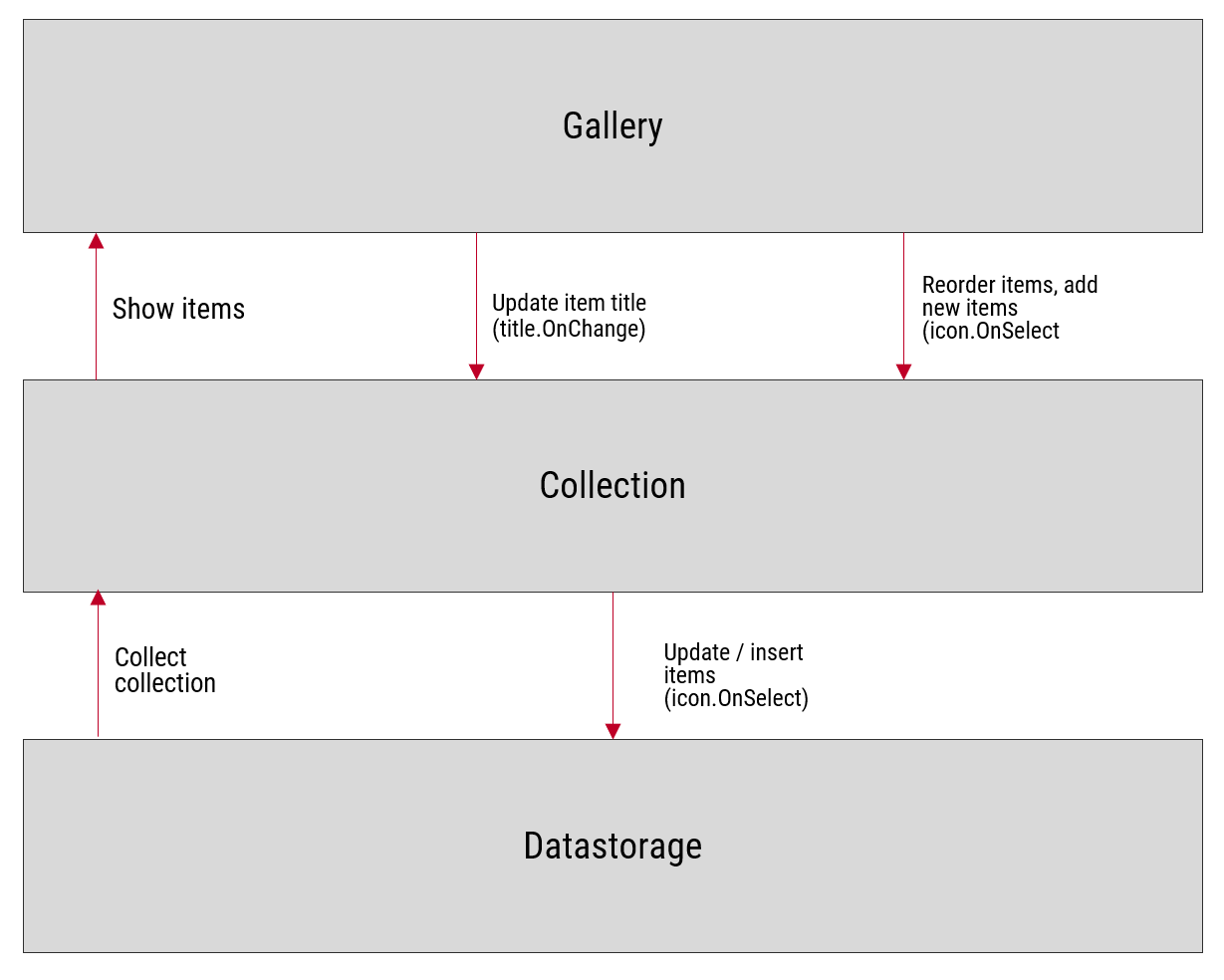 Kun galleria on kytketty suoraan tietovarastoon, pysyy tekeminen yksinkertaisena. Kun tietovarastoa päivitetään Power Appsista käsin, päivittyvät tiedot automaattisesti myös galleriaan käyttäjän nähtäville.