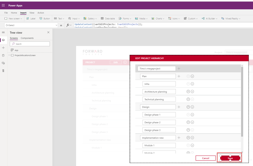 Lopuksi päivitetään ratkaisun päägallerian käyttämä colForProjectgallery-kokoelma vastaamaan muokattua kokoelmaa (colProjectHierarchyForEdit). Dialogi katoaa näkyvistä asetettamalla varEditProjects-muuttujan arvoksi false.