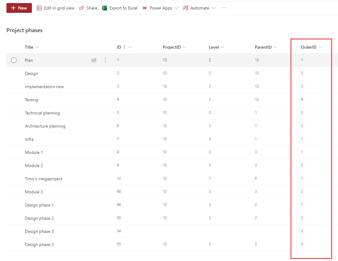 Jotta rivejä voisi uudelleenjärjestellä Power Appsissa, tulee tieto niiden keskinäisestä järjetyksestä tietenkin tallentaa. Lisätään projektin vaiheille (Project phases) tätä varten uusi sarake (OrderID).