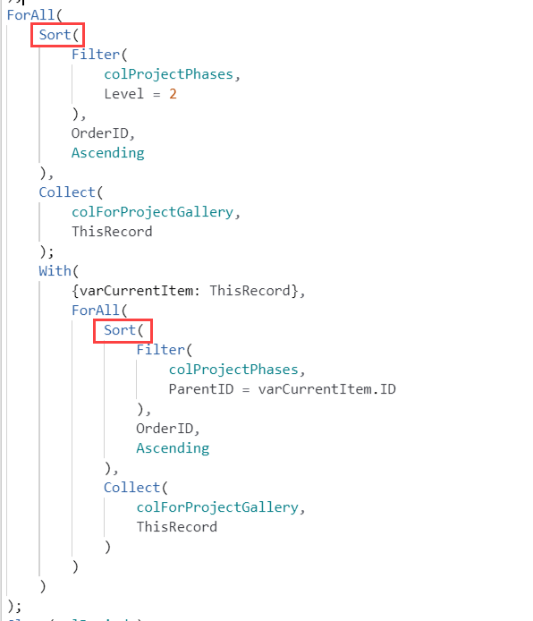 ForAll(Sort(Filter(colTmp,Level = 2),OrderID,Ascending),