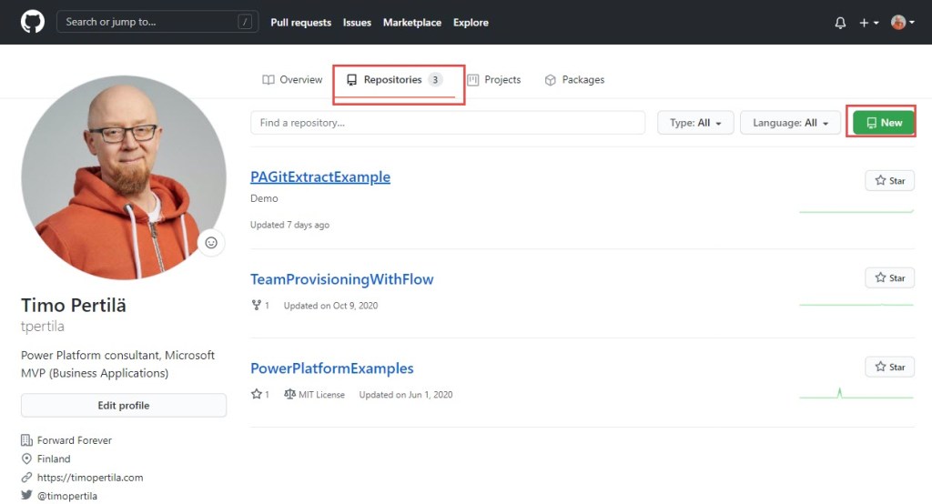Käytetään esimerkissämme versionhallintatyökaluna GitHub:ia. Luodaan sinne Power Appsiamme varten oma säilö (repository).