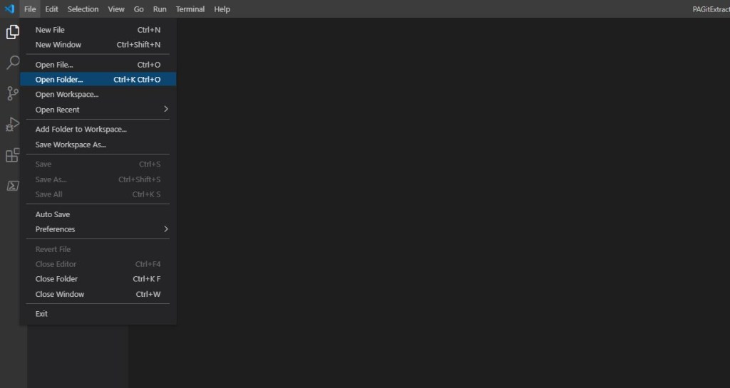 Luodaan omalle työasemalle säilöä vastaava kansio ja avataan se Visual Studio Codella (Open folder).