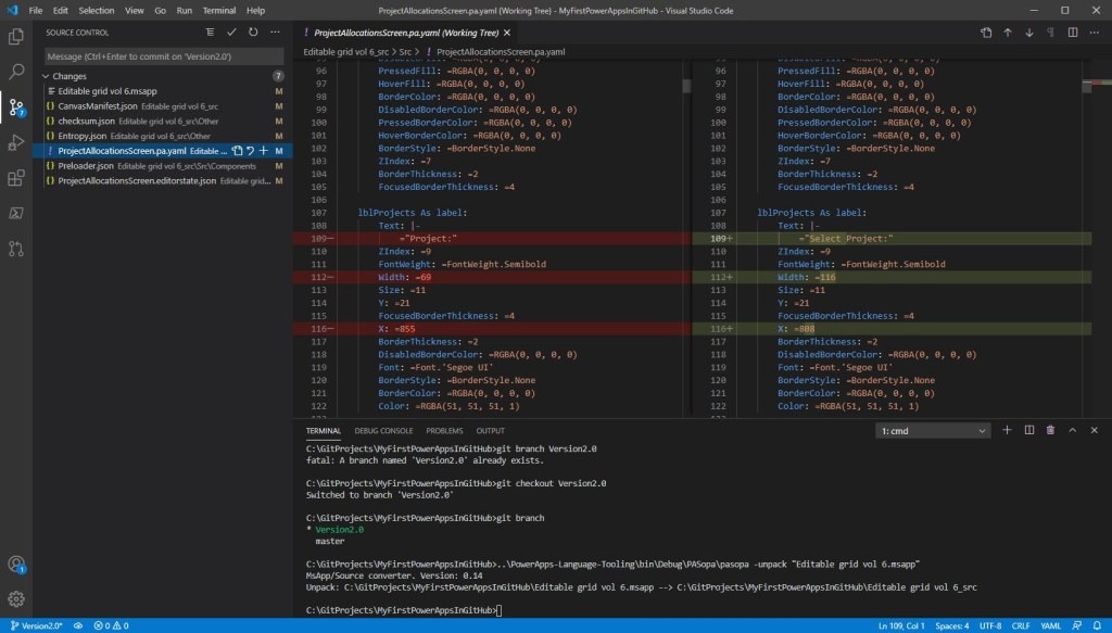 Power Appsistamme on valmiina uusi versio (Version2.0). Luodaan sitä varten uusi haara (branch) ja siirrytään työskentelemään siihen (checkout) .