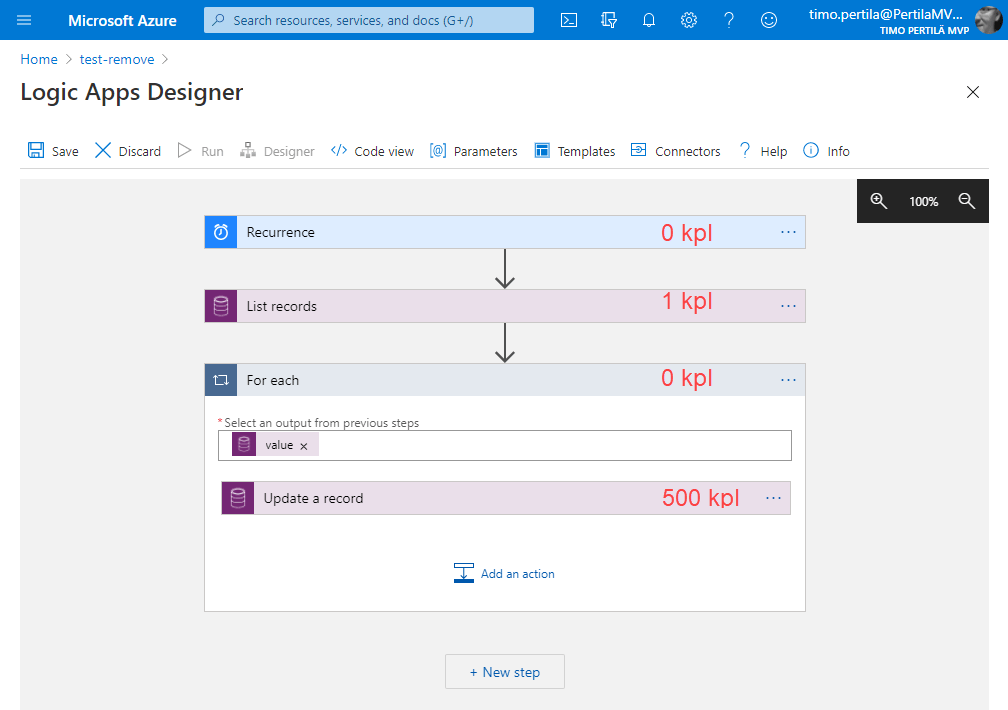 Yllättäen maksatkin toiminnoista tavallaan kahteen kertaan. Logic Appsin suoriteperusteista maksua + kulutat Power Platformin pyyntösaldoa.