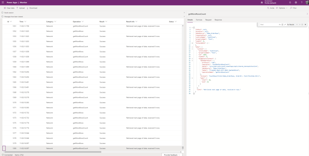 Power Apps Monitorista näemme mitä tapahtuu, kun gallerian tarvitsemat tiedot ladataan. 1380 Network-kategorian tapahtumaa!