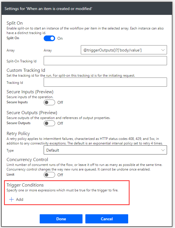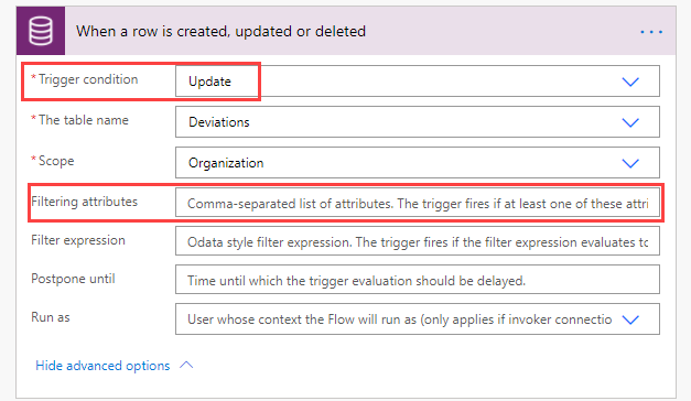 Mikäli Flow käynnistyy tietovarastossa tapahtuvasta muutoksesta (uusi rivi luodaan, joku muokkaa olemassa olevaa jne) on usein järkevää hyödyntää käynnistimen ehtoja (Trigger Conditions). Niiden avulla Flow määritellään käynnistymään esimerkiksi ainoastaan rivin tilatiedon tai vastuuhenkilön muuttuessa.