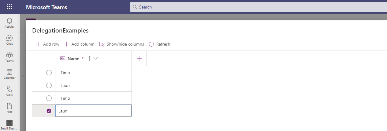 Luodaan Dataverse for Teamsiin taulu (DelegationExamples), jossa on neljä riviä. Kaksi Timoa ja kaksi Lauria.