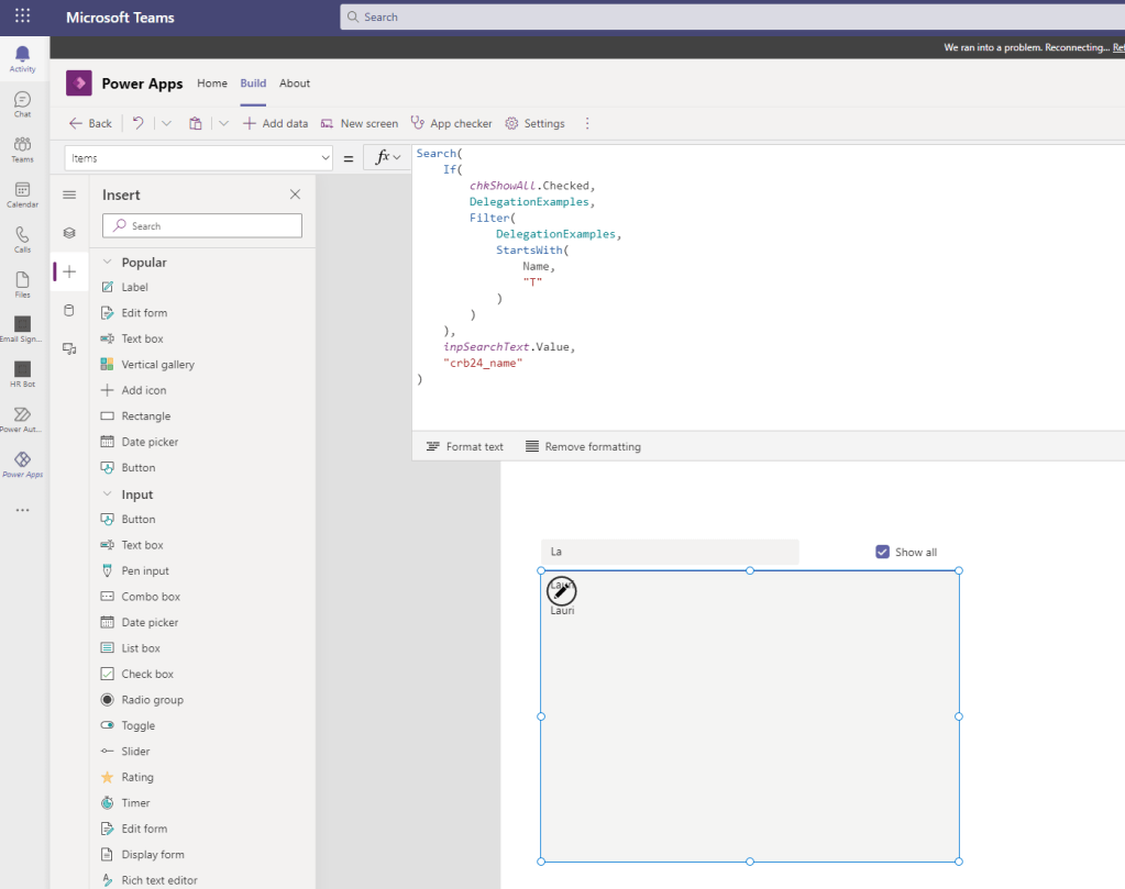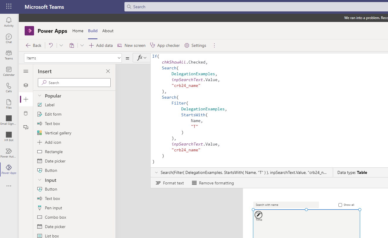 Mistä tämä johtuu? Search ja Sort ovat takuuvarmasti Dataverse for Teamsin kanssa delegoitavia kyselyjä.