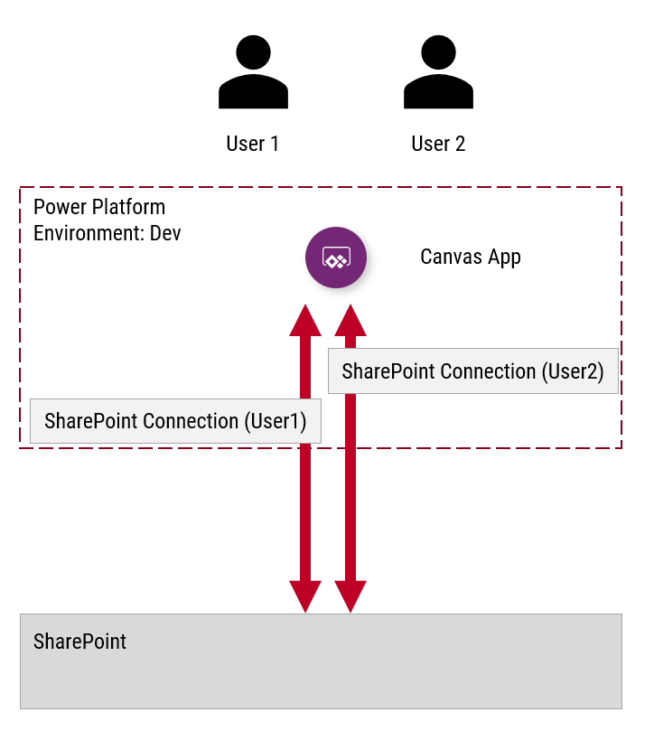 Esimerkiksi jos käyttäjä käyttää SharePointia hyödyntäviä Power Appseja, jotka sijaitsevat eri ympäristöissä, on käyttäjälle jokaisessa näistä ympäristöissä luotuna oma SharePoint-yhteys.