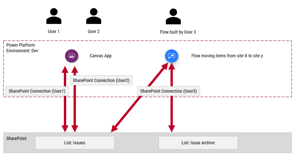 Esimerkiksi sovellus, jolla käyttäjät luovat ja muokkaavat havaintoja (issues). Sovelluksen tekijä on luonut työnkulun (flow), joka kopioi havainnot samantien toiseen paikkaan (arkistoon). Sovelluksen käyttäjillä ei kuitenkaan ole oikeuksia koko arkistoon.