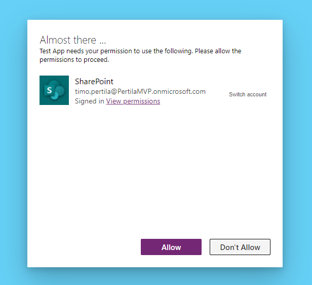Mitä tapahtuu käyttäjän käynnistäessä sovelluksen ensimmäisen kerran? Häneltä pyydetään lupa sovelluksen käyttämien tietolähteiden käyttöön (yhdistimien avulla). Antamalla suostumuksen, Power Platform luo käyttäjän käyttöön hänen omalla käyttäjätunnuksellaan tarvittavat yhteydet.