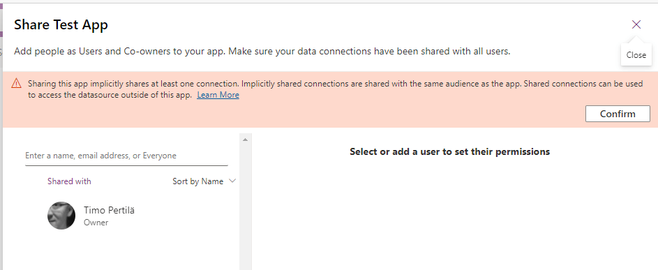 Ikävä kyllä nämä varoitustekstit ovat usein täyttä hepreaa kansalaiskehittäjälle. Painetaan Confirm ja taas mennään.
