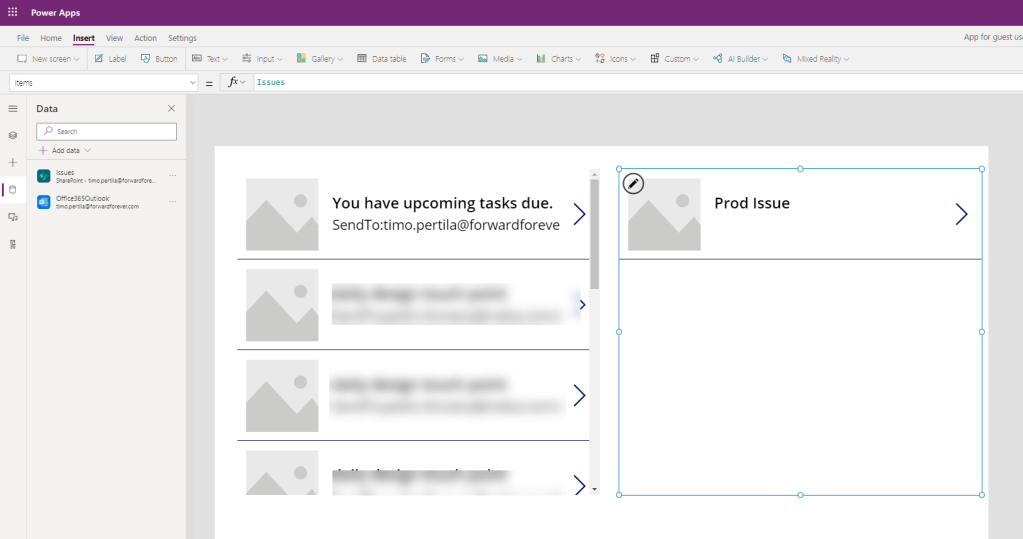 Luodaan sovellus, joka käyttää Outlook ja SharePoint -yhdistimiä. Sovellus näyttää käyttäjän sähköpostit, sekä listaa SharePoint-listalla olevat havainnot.
