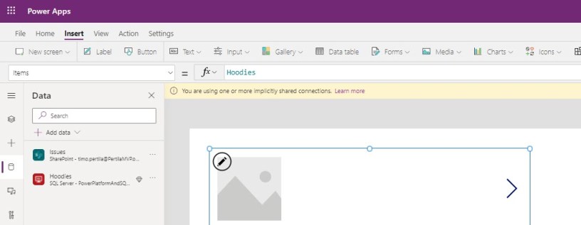 Kuvitellaan että meillä on (Canvas) Power Apps, jonka tietovarastona on SharePoint-lista. Kaikki SharePointiin liitttyvät toimenpiteet tehdään SharePoint-yhdistintä hyödyntäen.