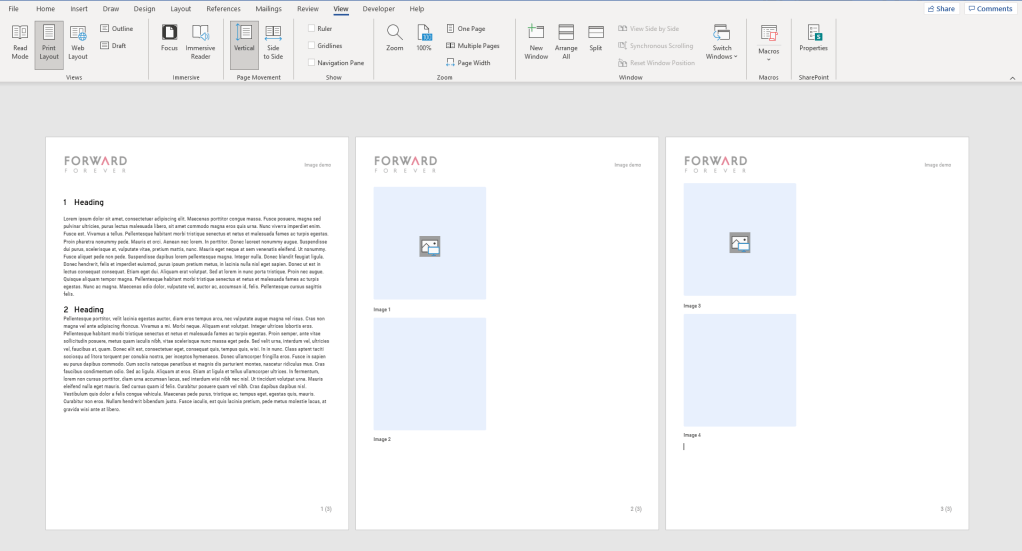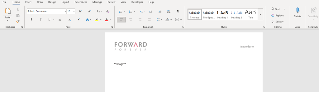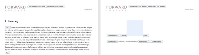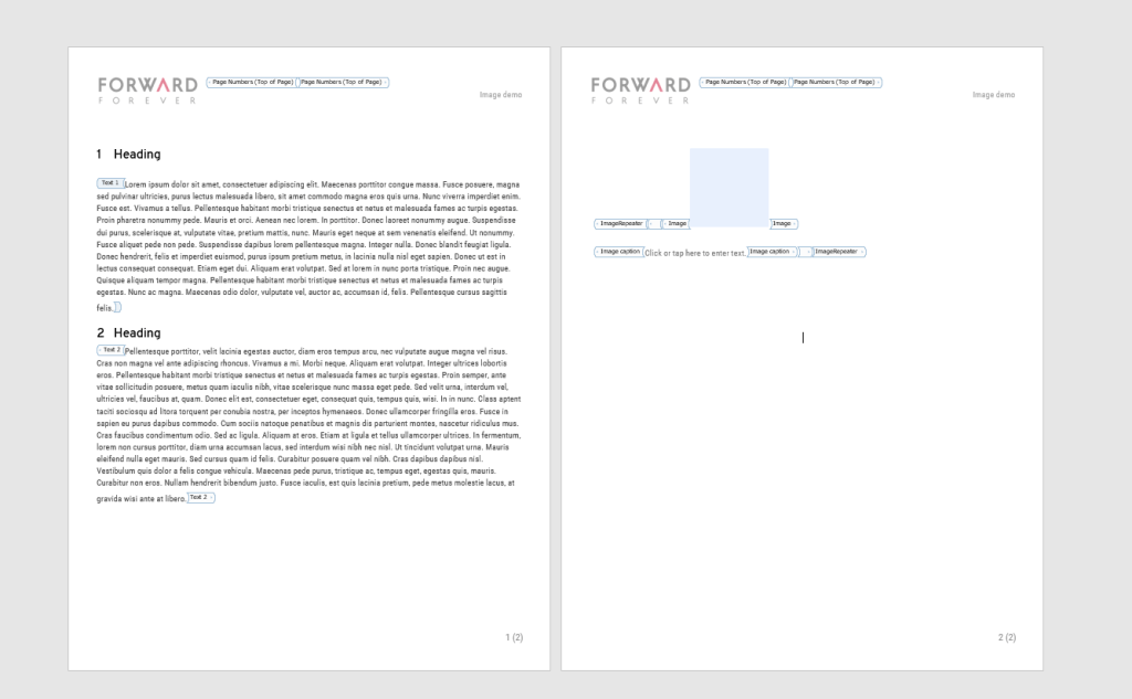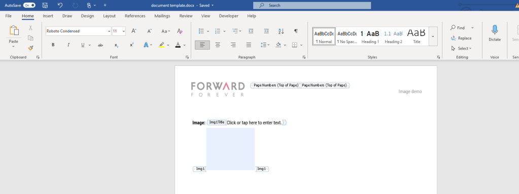 Tehtävä kuulostaa todella yksinkertaiselta. Luodaan Wordilla mallipohja, jonka alussa on paikka dynaamisesti täytettävälle tekstisisällölle. Pohjan lopussa on toistuva osio (Repeating Section Content Control), jonka sisällä on kuvaelementti kuvaa varten, sekä sekä tekstielementti kuvan nimeä varten.