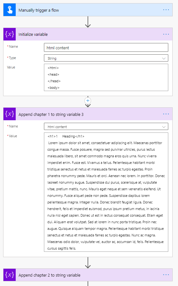 Aloitetaan Flow alustamalla muuttuja, johon muodostamme dokumenttimme sisällön html-muodossa. Lisätään siihen muutama kappale tekstiä.