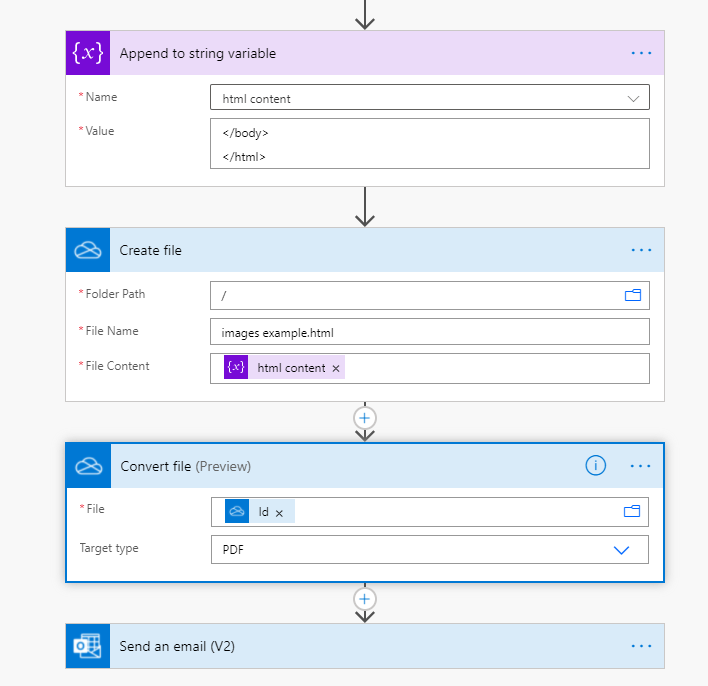 Lopuksi täydennetään html-tiedosto ja tallennetaan se OneDriveen. Josta se sitten konvertoidaan PDF:ksi ja lähetetään edelleen sähköpostilla.