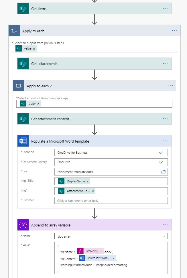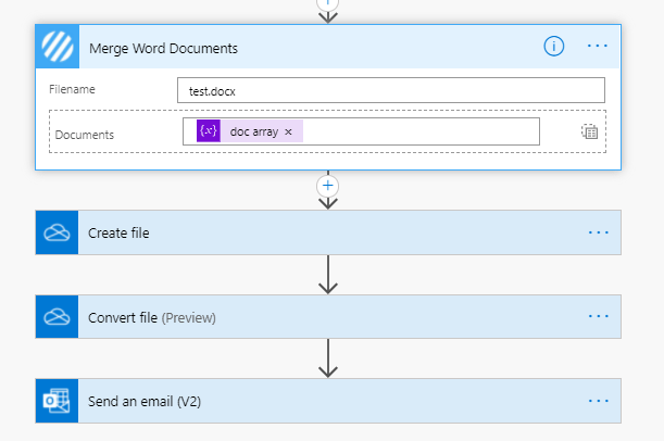 Lopuksi kaikki muodostetut word-dokumentit yhdistetään Encodianin Merge Word Documents -toiminnolla, muunnetaan OneDriven toimintojen avulla PDF:ksi ja lähetetään sähköpostilla.