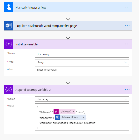 Flow’ssa aloitamme dokumentin ensimmäisen sivun täyttämisellä, jonka jälkeen lisäämme muodostetun dokumentin array-tyyppiseen muuttujaan (doc array). Muuttujaan kerätään kaikki yhdistettävät dokumentit. JSON-muodossa sisältäen seuraavat kentät.