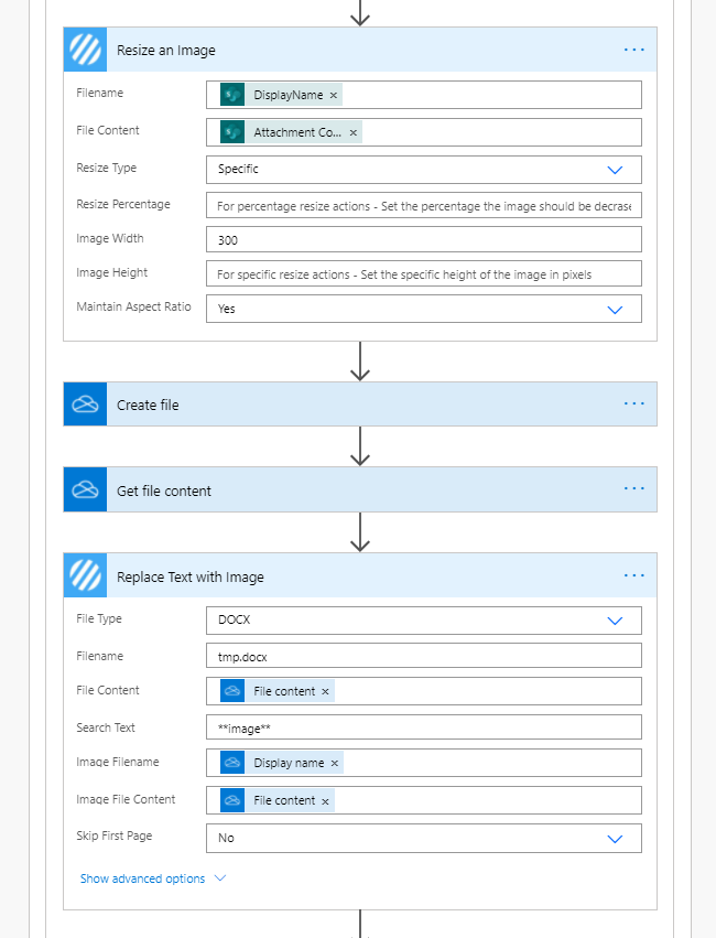 Nyt Flow’ssa ensin pienennetään kuva 300 pikseliä leveäksi (liian suuret kuvat eivät mahdu dokumenttiin leveyssuunnassa). Tämän jälkeen kuva tallennetaan OneDriveen ja haetaan saman tien sen sisältö sieltä. Tämä on laiskan tapa varmistaa että sisältö (file content) on toiminnoille sopivassa muodossa.