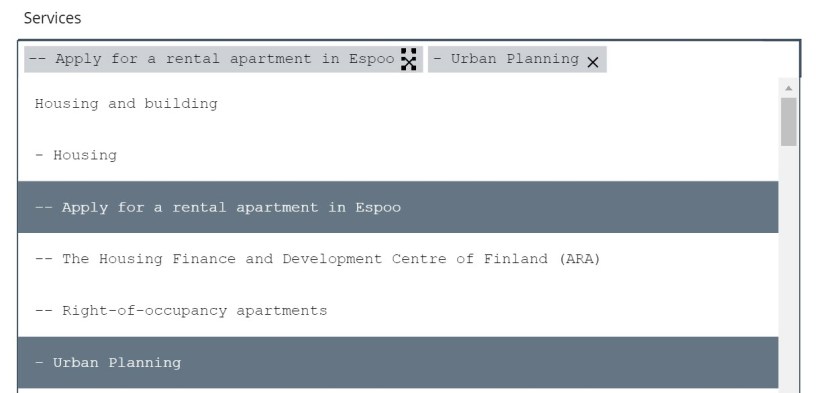 Haluaisimme seuraavaksi tarjota käyttäjälle mahdollisuuden valita vapaasti n kappaletta rivejä palveluhierarkian eri tasoilta. Eli yhdeltä listalta / alasvetovalikosta useita riviä.
