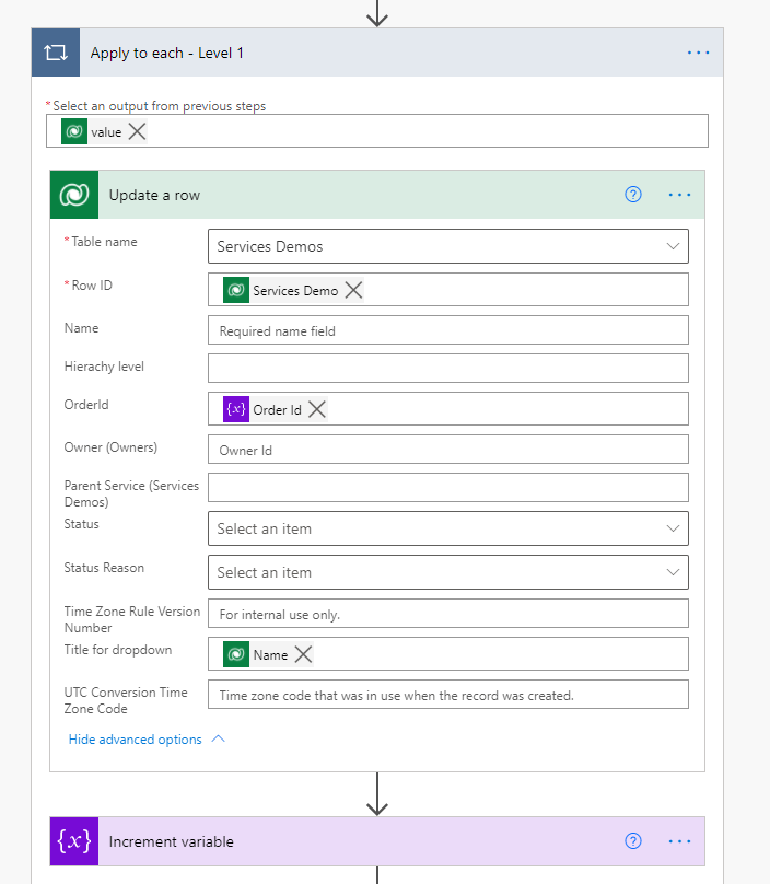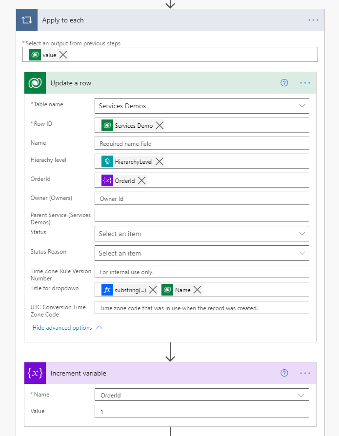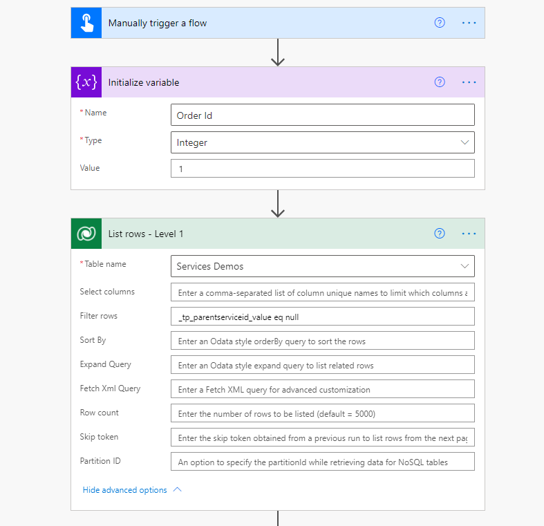 Rakennetaan seuraavaksi flow, joka käy läpi palveluhierarkian ja tallentaa jokaiselle riville järjestysnumeron siten että palvelut voi listata oikeassa järjestyksessä esim. alasvetovalikkoon sovelluksessamme.