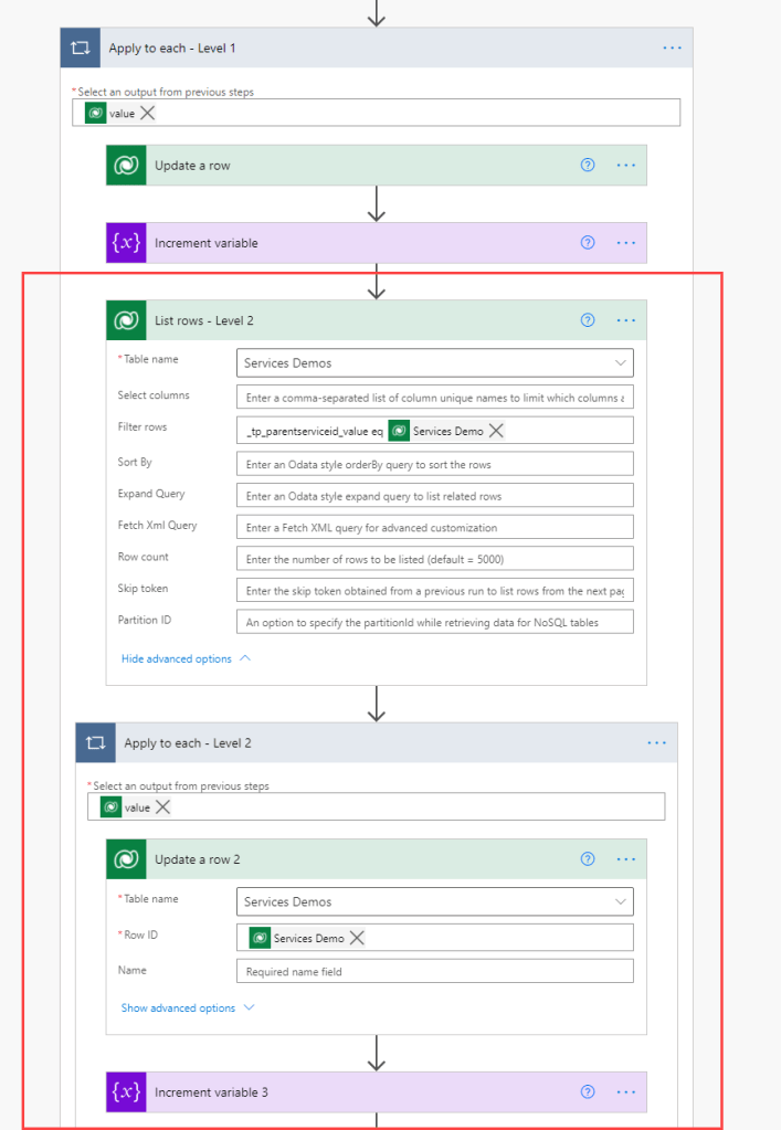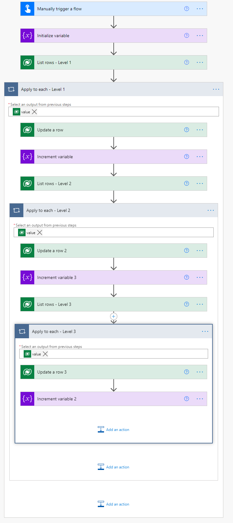 Ratkaisu on helposti ymmärrettävä, mutta se toimii nyt vain 3-tasoisella hierarkialla. Jokaista uutta tasoa varten pitäisi flow’hun lisätä uusi sisäinen silmukka. Sisäisiä toimintoja flow’ssa voi olla maksimissaan 8 kappaletta.