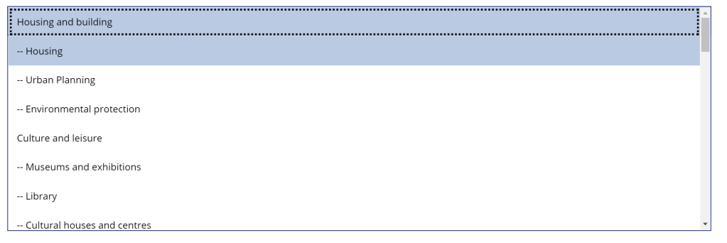 Kontrollissa näytettävään kenttään (Title for dropdown) asetetaan hierarkiatasoa vastaava määrä ”-” merkkejä.