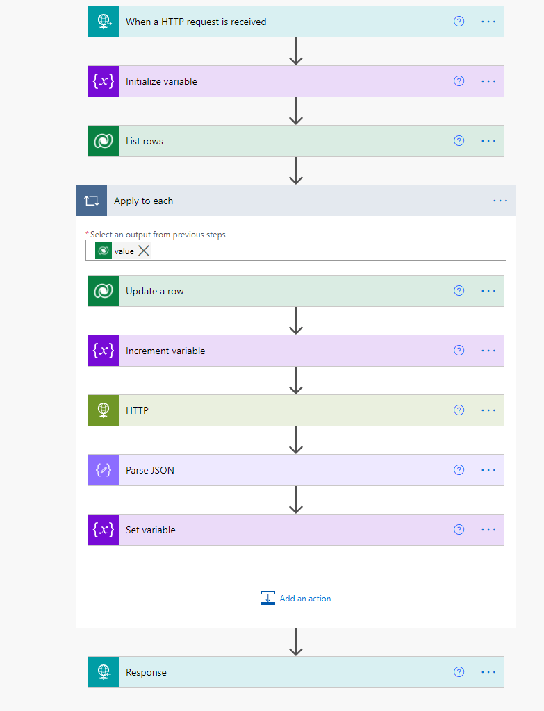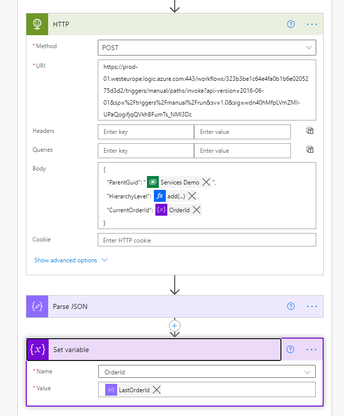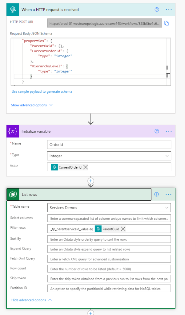 Luodaan flow, joka käynnistyy http-triggerillä (Child flow’t olisivat näppärämpiä tehdä, mutta ne eivät voi kutsua itse itseään).