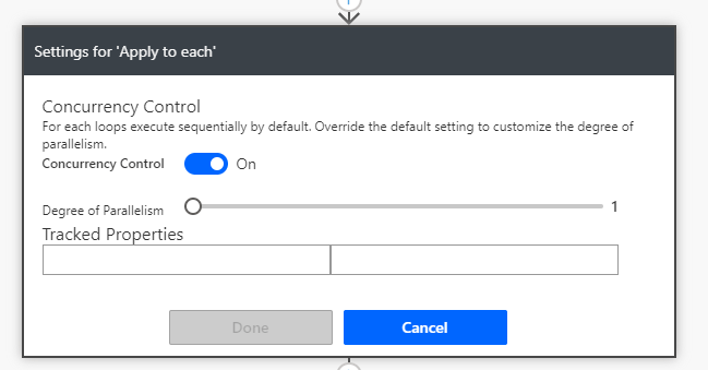 Huomaa että silmukkaa (Apply to each) ei voida ajaa rinnakkain, eli käydään asettamassa rinnakkaisuuden asteeksi 1.