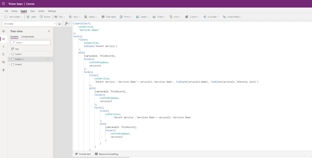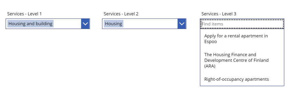 Käyttäjän tulisi valita Power Appsissa palvelu. Voimme toteuttaa helposti käyttöliittymän, jossa käyttäjä valitsee ensin palveluhierarkian päätason ja sen jälkeen seuraavasta kontrollista seuraavan tason jne.
