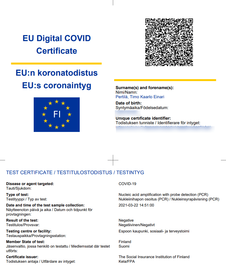 Ratkaisun idea on yksinkertainen. Jokainen voi ladata omakanta-palvelusta EU:n koronatodistuksen. Niitä on kolmenlaisia.