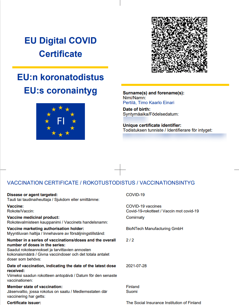 Todistuksissa on QR-koodi, joka sisältää todistuksessa esitettävät tiedot.