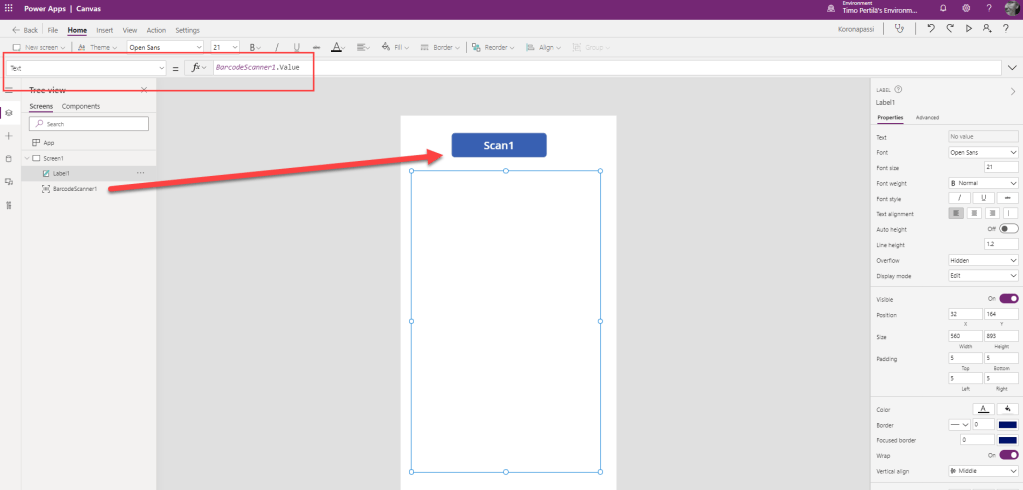 Tehdään nopeasti Power Apps, joka aluksi vain näyttää luetun QR-koodin sisällön (BarcodeScanner1.Value)